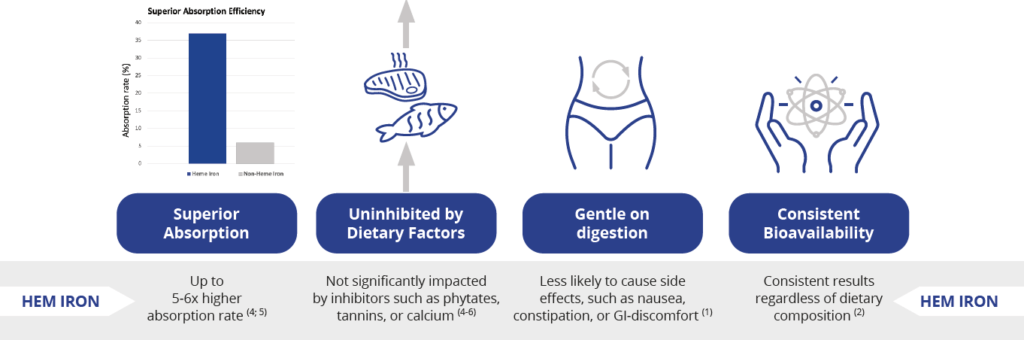 Iron metabolism is unique, as the body lacks an excretion system, relying on dietary intake to replace losses and support growth during critical life stages such as infancy, childhood, adolescence, pregnancy, and postmenopause (6-7). Several studies have concluded that investigated Hem Iron is the ideal choice for maintaining iron balance during these crucial stages of life (1-7), c.f. infographics.